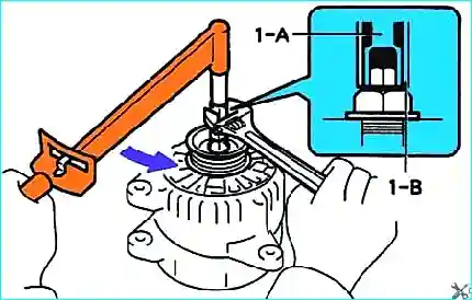 Для затяжки гайки крепления шкива необходимо повернуть специальное приспособление (1-А) по часовой стрелке. Момент затяжки: 111 Нм.