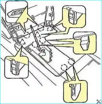 Преодолевая сопротивление фиксаторов, отводим верхнюю панель облицовки тоннеля пола в сторону и отсоединяем от выключателей колодки жгутов проводов