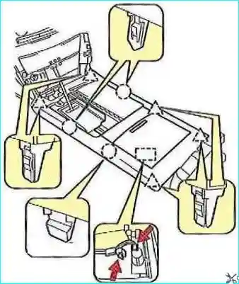 Вынимаем три фиксатора и снимаем держатель коврика салона