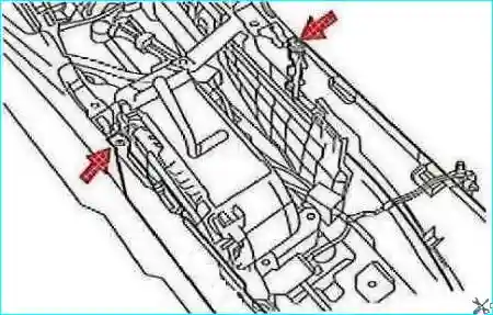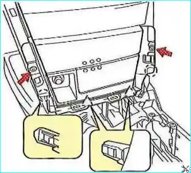Преодолевая сопротивление фиксаторов, отводим накладку центральной облицовки тоннеля пола в сторону и отсоединяем от выключателей обогрева передних сидений колодки проводов.