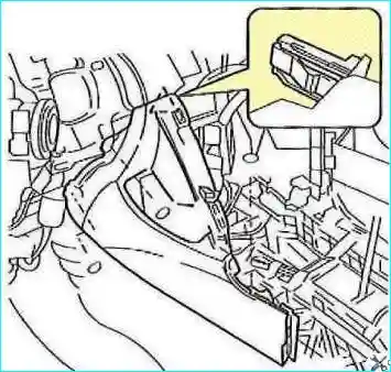 Отсоединяем от облицовки воздухоподводящий шланг и снимаем левую нижнюю облицовку панели приборов