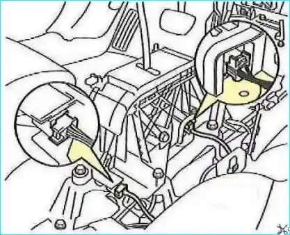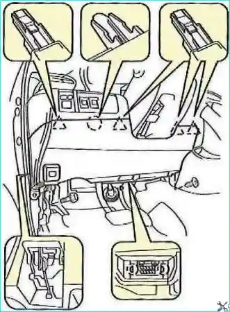 Отсоединяем колодки жгутов проводов от электронного блока управления (ЭБУ) системы блокировки селектора и от датчика положения селектора