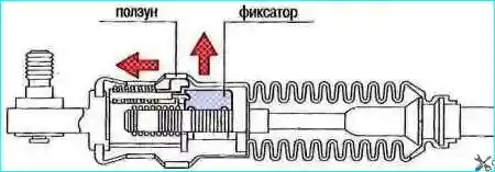 Сдвигаем, ползун в направлениях, указанных стрелками, и извлекаем фиксатор
