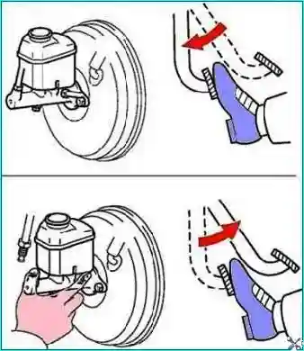 Снимаем главный тормозной цилиндр, открутив болты крепления, показанные стрелками на рисунке