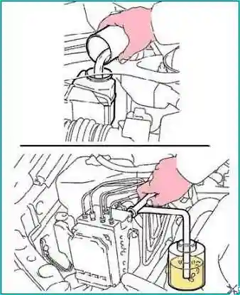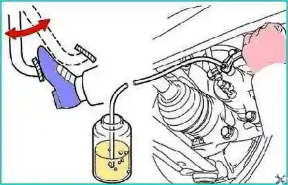 Заполнив бачок главного тормозного цилиндра жидкостью для сцепления, удаляем воздух из системы сцепления