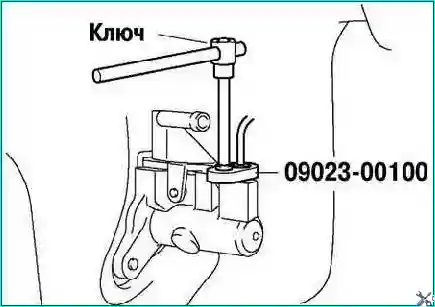 Используя специальное приспособление 09023-00100 и специальный ключ, отсоединяем шланг от главного цилиндра сцепления