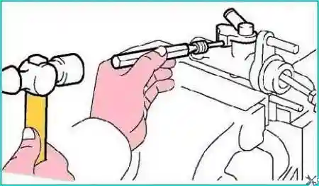 Используя бородок с тонким жалом (5 мм) и молоток, выбиваем шлицевой пружинный штифт