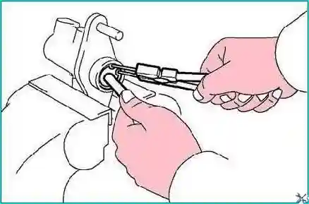 Утапливая стержень поршня, с помощью клещей для снятия и установки стопорных колец снимаем стопорное кольцо