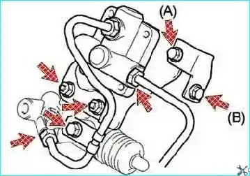 Устанавливаем кронштейн шланга и закрепляем его двумя болтами. Момент затяжки: болт (А) – 12 Нм; болт (В) – 39 Нм
