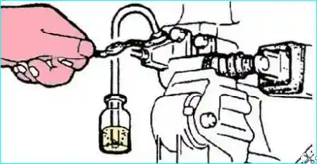 Надеваем на клапан шланг и опускаем его конец в емкость с небольшим количеством тормозной жидкости.
