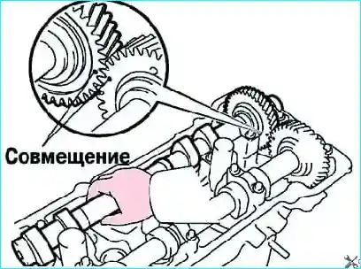 Введите в зацепление шестерни привода распределительных валов выпускных и впускных клапанов, совместив друг с другом установочные метки (две точки) на шестернях.