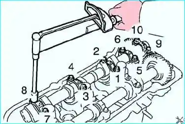 Поверните распределительный вал и расположите кулачки рабочими выступами вверх, проверьте и отрегулируйте, при необходимости, зазор в приводе клапанов.