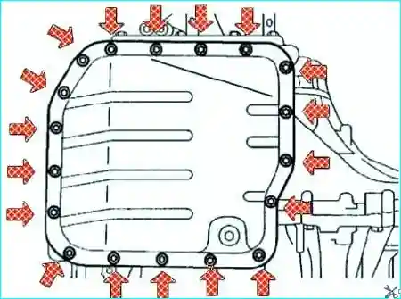 Смажьте болты крепления поддона герметиком. Герметик: THREE BOND 2430 или аналог.