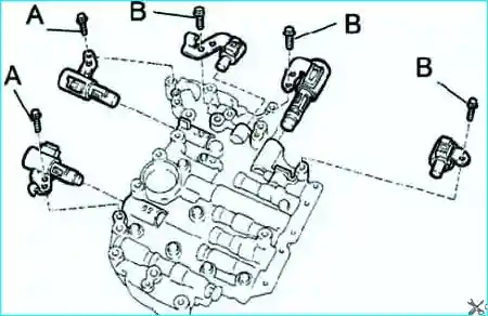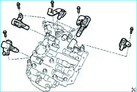 Отверните 5 болтов крепления и снимите 5 электромагнитных клапанов переключения передач (рис. 8)