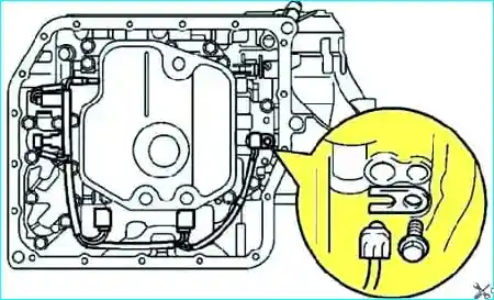Снимите болт и стопорную пластину и отсоедините датчик температуры рабочей жидкости коробки передач (рис. 3)