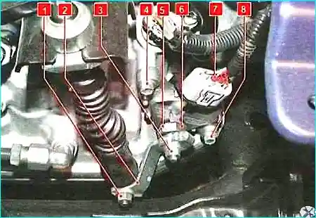 Снимаем датчик с коробки передач, выкрутив его болты крепления 4 и 8