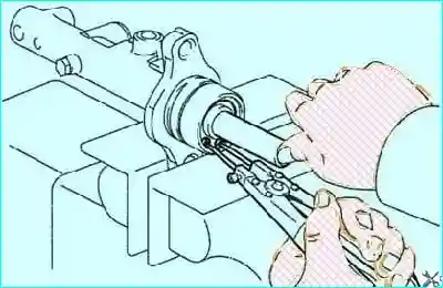 Нажмите на поршень отверткой и с помощью тонкогубцев для снятия пружинных колец снимите пружинное кольцо (рис. 4).