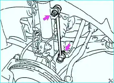 Отверните 2 гайки крепления и отсоедините левую и правую стойки стабилизатора поперечной устойчивости от нижнего рычага (рис. 1).