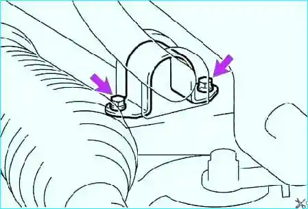 Отверните 2 болта хомута и снимите демпфер стабилизатора поперечной устойчивости (рис. 2).