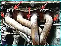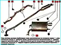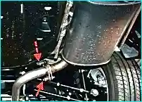 Глушители, приемную трубу и подушки подвески снимаем для замены, а также при снятии агрегатов, требующих снятия элементов системы выпуска отработавших газов
