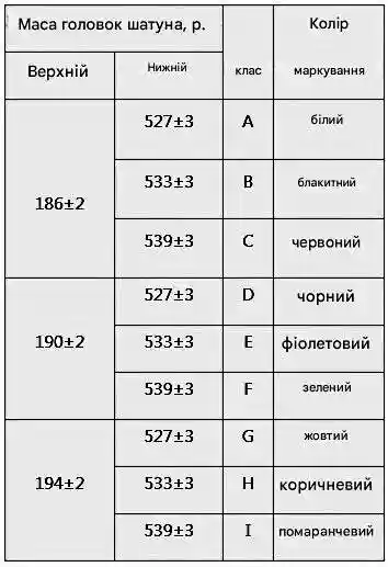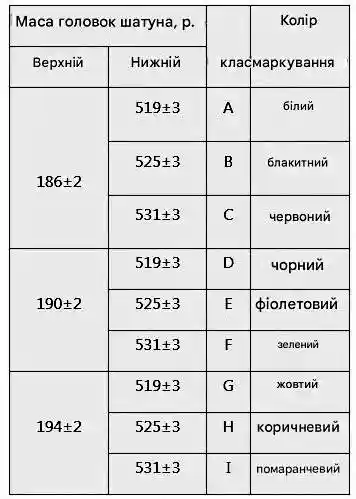 За масою верхньої та нижньої головок шатуни поділяються на класи (таблиця), що маркуються фарбою на стрижні шатуна.